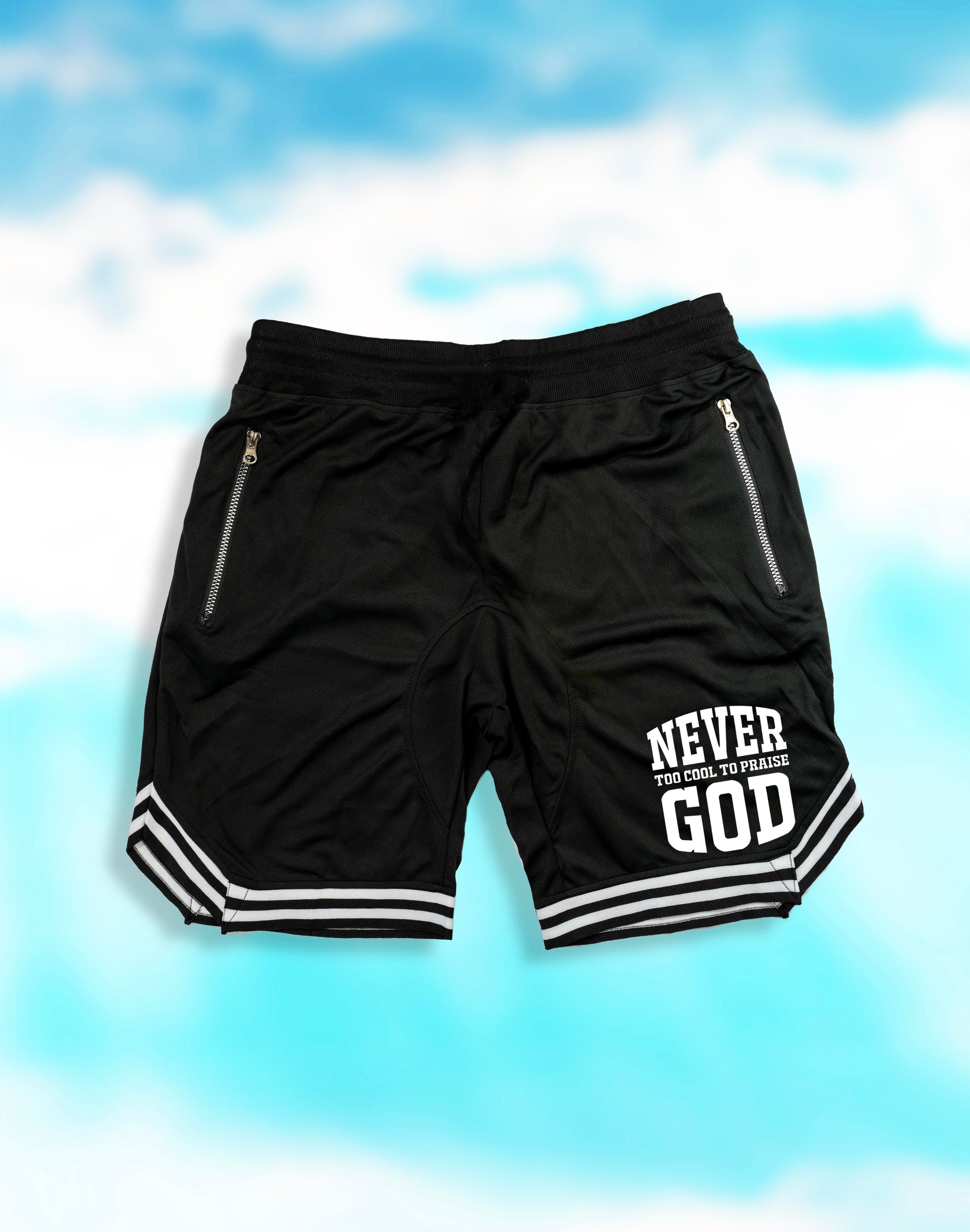 Introducing our 100% polyester basketball shorts, designed for athletes who love to show their faith. These black and white shorts feature are adorned with the empowering phrase "Never Too Cool To Praise GOD". Crafted for comfort and flexibility, these shorts are perfect for your game, practice, or casual wear. Be inspired and inspire others with our unique and stylish sports gear!